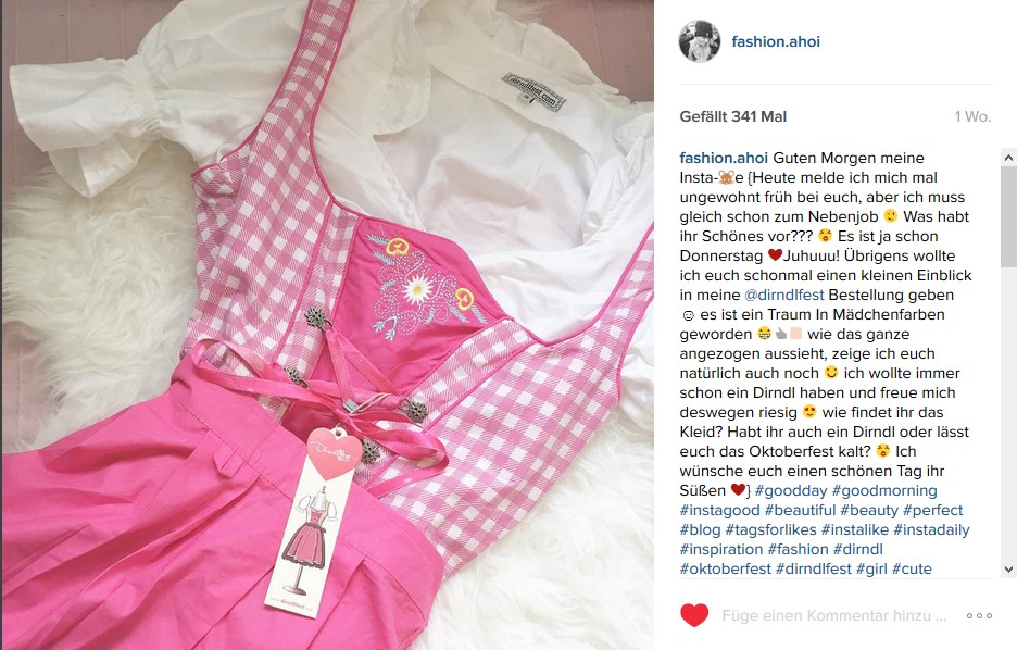 Der Oktober ist schon fast wieder zur Hälfte um und wir bewegen uns mit großen Schritten auf den November zu. Dicke Jacken, Stiefel und Mützen werden also bald wieder unsere täglichen Begleiter sein! Aber bevor es so weit ist, möchte ich euch noch etwas ganz Besonderes vorstellen… Nämlich mein neues Dirndl von Dirndlfest. Eigentlich bin ich ja überhaupt kein Trachten-Fan, aber einmal im Jahr gehe ich gerne auf’s Oktoberfest, auch wenn es nicht das echte ist, sondern nur ein ’nachgemachtes‘ in einer anderen Stadt. Und ohne ein waschechtes Dirndl geht das natürlich nicht! 🙂